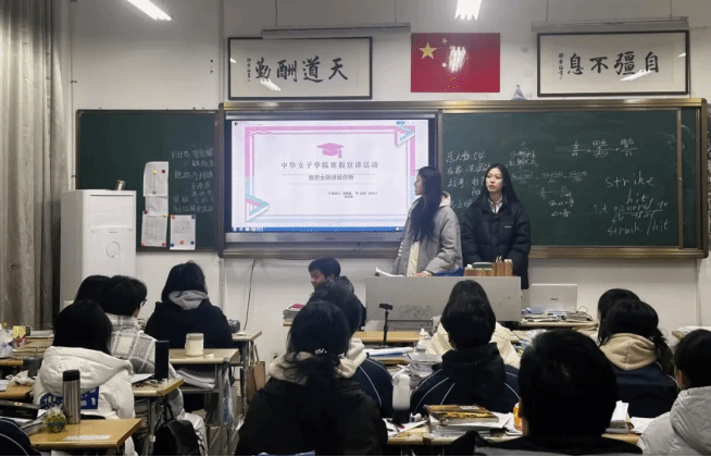 非常荣幸可以在这次寒假回到我们的母校浙江省台州市外国语中学宣传和介绍中华女子学院。因为我们俩都是艺术生,这次也是在艺术班进行宣讲。在确认通过学校招生办公室的初审之后,我们就积极联系高中母校,终于在1月23日入校进行宣讲。这个时间点刚好在学弟学妹们艺术类首考和统考过后,这个阶段的同学们,既有对大学的憧憬也有对未来的迷茫,这既是压力也是动力。能在这个时候为他们在未来择校上提供一些经验和建议,是件特别荣幸的事。