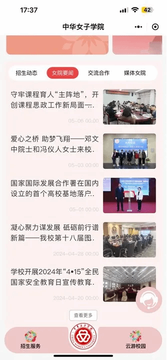 包括招生动态,女院要闻,交流合作,媒体女院,实时了解招生信息,更新最新动态,各种学校活动预告,家长可以第一时间了解学校的发布信息。