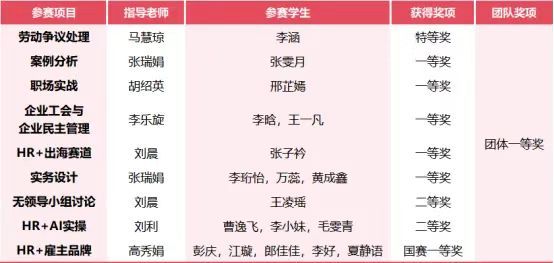 取得了劳动争议处理赛道特等奖,案例分析、职场实战、企业工会与企业民主管理、HR+出海及实务设计等6个赛道一等奖,其中京津冀蒙晋赛区独创的HR+雇主品牌赛道获得国赛一等奖。最终以优异表现夺得团体一等奖,成功晋级全国赛。
