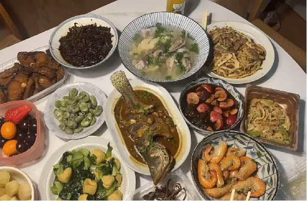 桌上摆满刚出锅的鸡鸭鱼肉