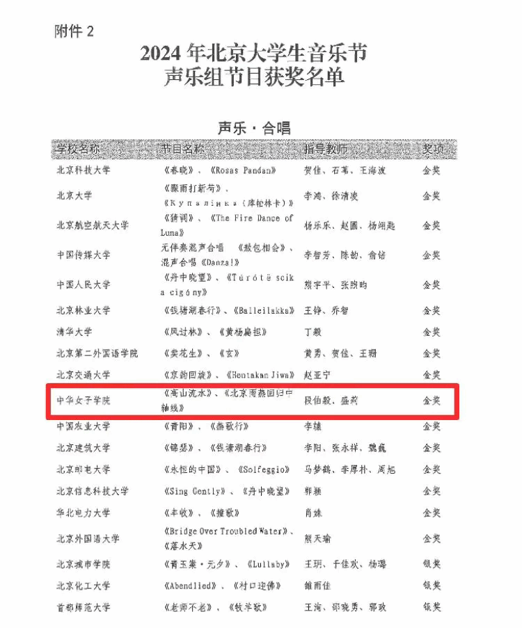 北京市教委近期公布了2024年北京大学生音乐节评审结果。我校选送的女生合唱原创作品《高山流水》《北京雨燕回归中轴线》在首都高校选送的上百件作品中脱颖而出,最终荣获声乐组金奖。词曲作者、指导教师段伯毅老师一举获得“优秀指挥”、“优秀创作”、“优秀指导教师”等多个奖项。