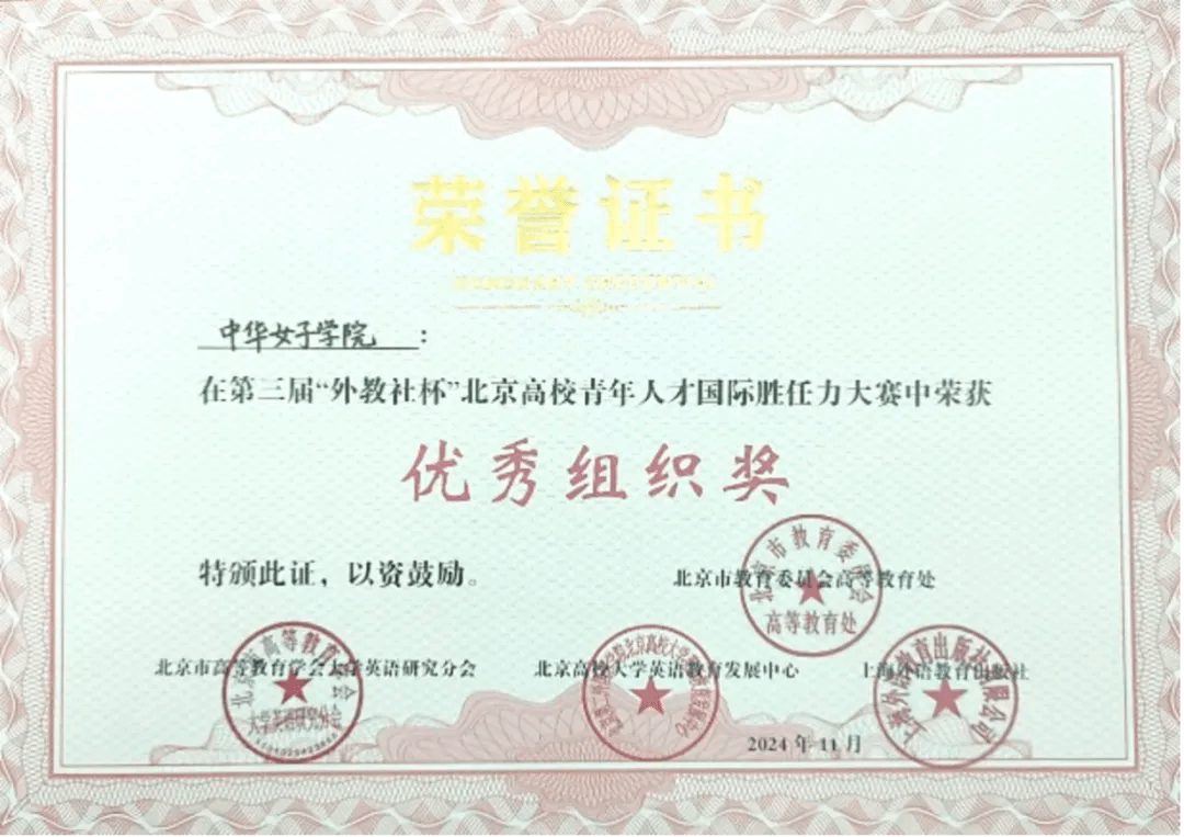 2024年11月2日,第三届“外教社杯”北京高校青年人才国际胜任力大赛决赛在中国人民大学举办。我校代表队从容、自信参赛,斩获二等奖。我校师生代表将目光聚焦于“女性赋能”这一议题,在孙彦彬、王丽娟老师的悉心指导下,学生广泛收集资料、精心撰写提案、用心制作海报,成功获得了决赛资格。由 23 级社会学专业杨炎祺、23 级女性学专业毛翎和格格陶莉所组成的团队,在决赛的舞台上作为女院之声,发出了为全球女性赋能的时代强音。三位同学流畅展示提案、沉着回答评委和其他参赛队伍的提问,最终喜获二等奖。孙彦彬、王丽娟两位老师获得优秀指导教师奖,我校荣获了优秀组织奖,收获满满。获奖信息还被澎湃新闻网转发。链接如下