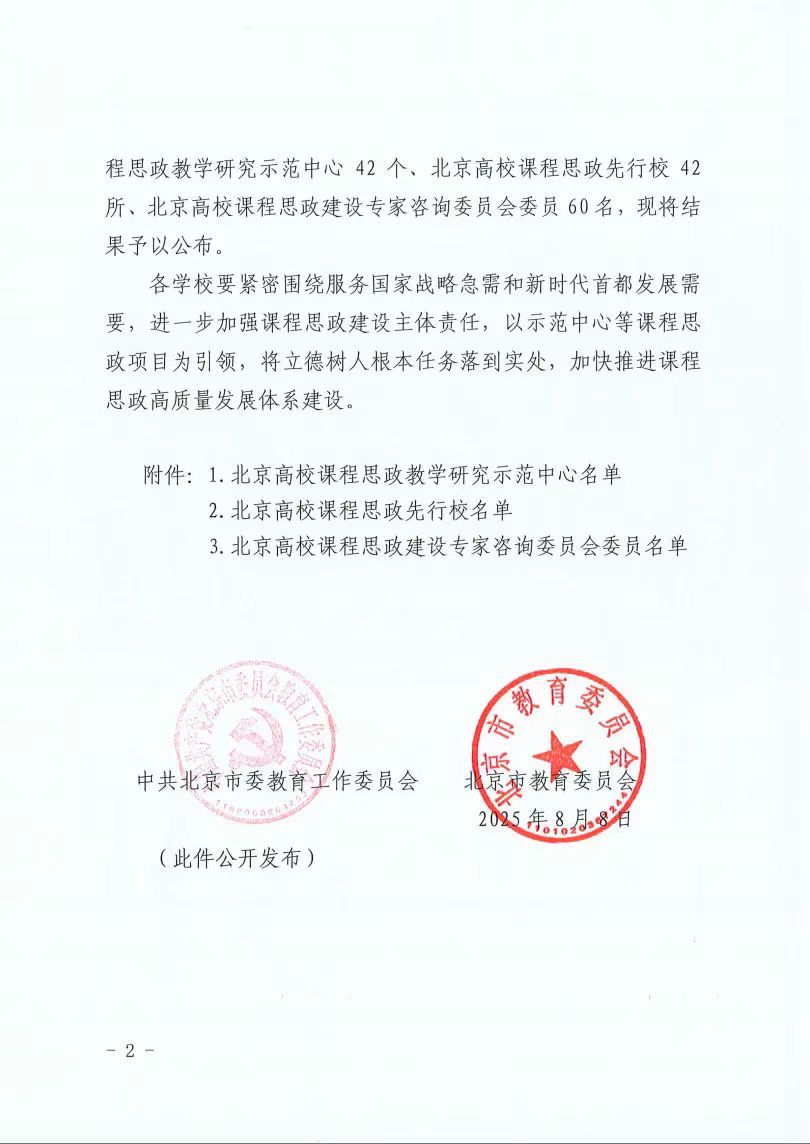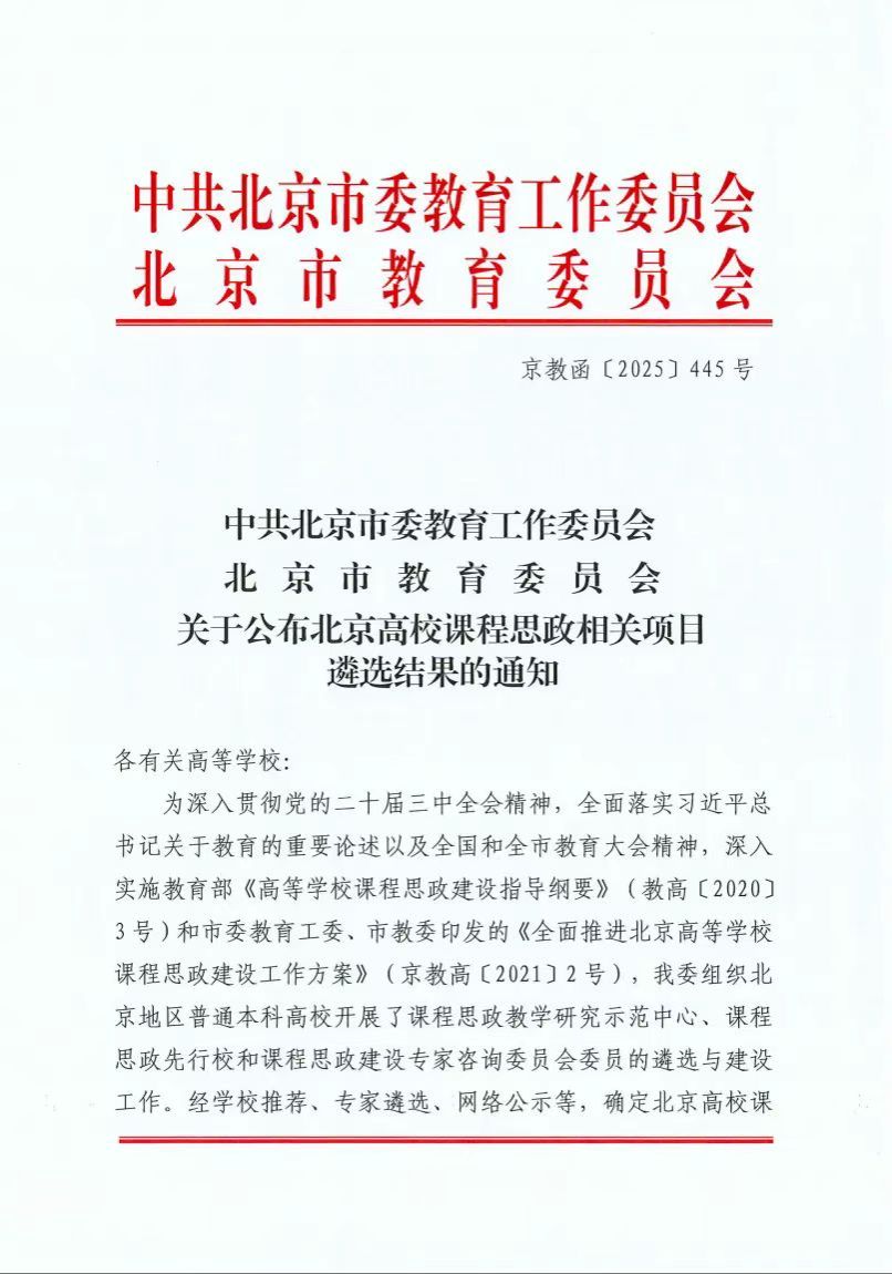 近日,中共北京市委教育工作委员会、北京市教育委员会联合发布了《关于公布北京高校课程思政相关项目遴选结果的通知》(京教函〔2025〕445号),我校妇女发展课程思政教学研究示范中心获评北京高校课程思政教学研究示范中心,李敏教授获评北京高校课程思政建设专家咨询委员会委员。
